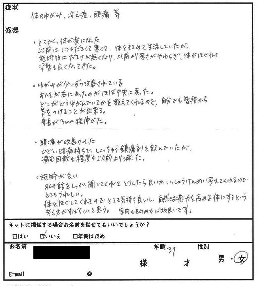 施術を受けたら、痛みがなくなって体が楽になりました。