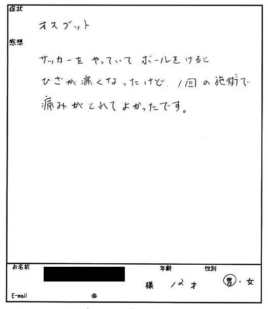 サッカーをやっていてボールをけるとひざが痛くなったけど、1回の施術で痛みがとれてよかったです